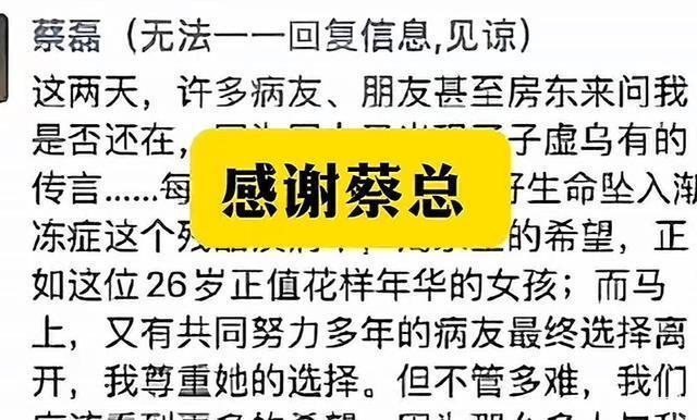 蔡磊确诊已经过去多年,但凭借金钱的力量始终在和病魔做抗争,反观普通人资源有限,只能默默地等待生命的消逝, 希望这个病症在广大有心人的努力之下能够尽早的“打败”,每一条生命的消逝都是一个家庭的伤痛,一路走好啊 ! 不知道您对此有什么看法呢?欢迎在下方评论区留下你的想法,喜欢文章记得点赞关注我们下期再见。 [免责声明]文章的时间、过程、图片均来自于网络,文章旨在传播正能量,均无低俗等不良引导,请观众勿对号入座,并上升到人身攻击等方面。观众理性看待本事件,切勿留下主观臆断的恶意评论,互联网不是法外之地。本文如若真实性存在争议、事件版权或图片侵权问题,请及时联系作者,我们将予以删除。 信息来源: 百度百科:蔡磊个人资料 98年女孩患渐冻症容貌巨变,做短视频博主赚治疗费,母亲:刚从ICU出来,一清醒就想做视频.红星新闻.2025-01-11 女生确诊渐冻症一年容貌巨变.猛犸新闻 确诊不到1年,26岁渐冻症女生去世,蔡磊回应:十分痛心.上观新闻.2025-02-27